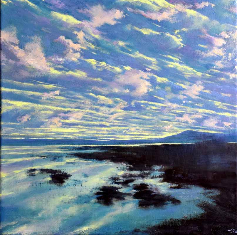 The sky and water are absolutely stunning, but I particularly like where the painting of the ground is rubbed or scratched back to create that roughness. The contrast between the clarity in the sky and water and the slightly blurred earth is lovely. Love the bluish land beckoning in the distance. Beautiful brush work, palette, and marriage of elements. This is suffused with energy and serenity. I can feel the air and smell the land and water. So calm and hopeful.